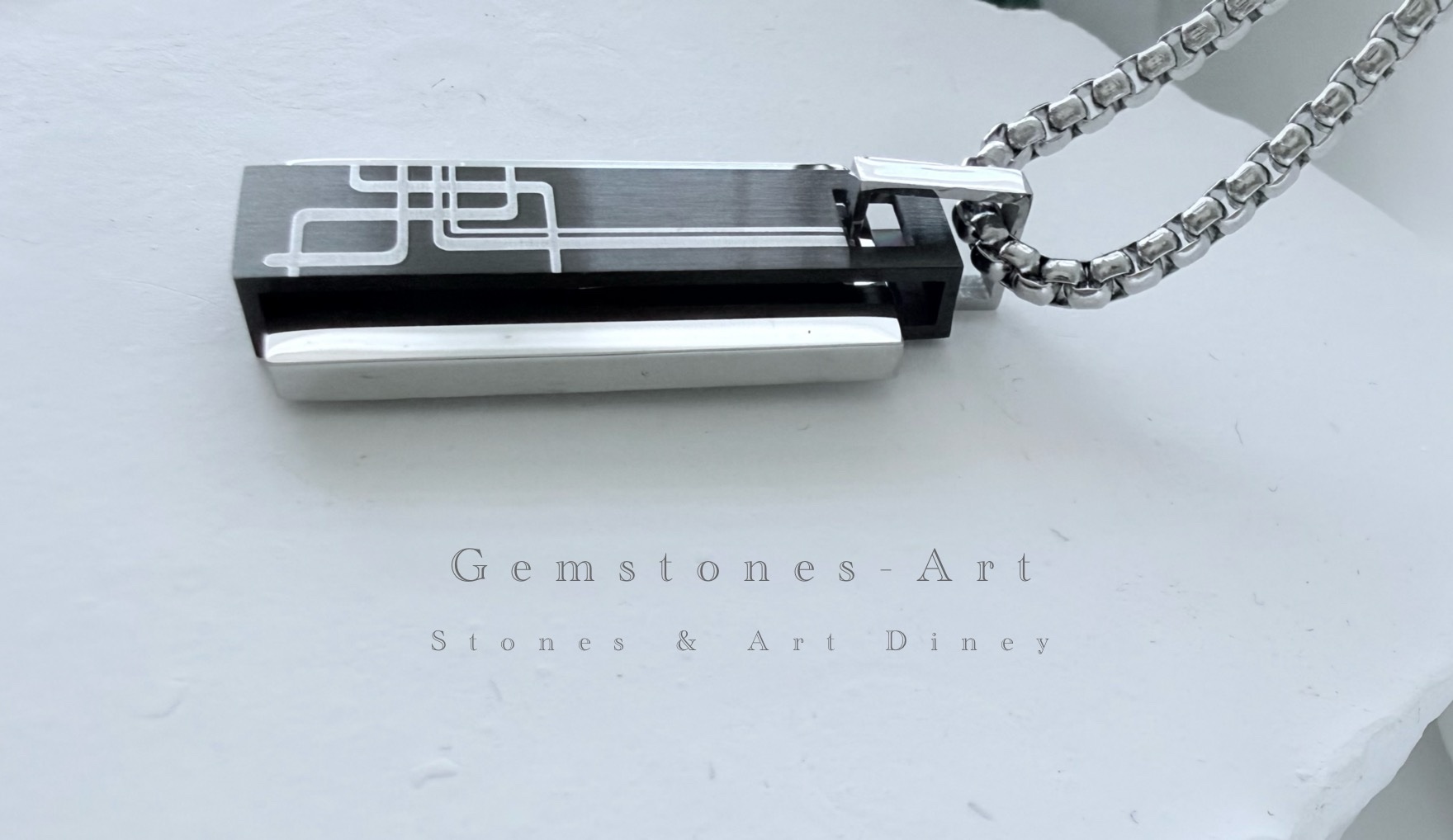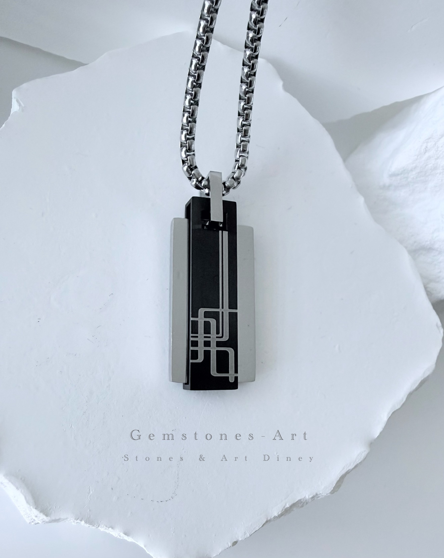 De hanger kenmerkt zich door een strakke, verticale vorm waarbij het zwarte centrale deel is versierd met zilverkleurige, in elkaar grijpende lijnen. Perfect voor dagelijks gebruik, of je nu gaat voor urban, minimalistisch of edgy.